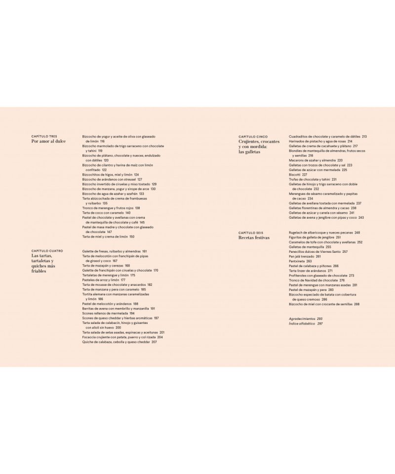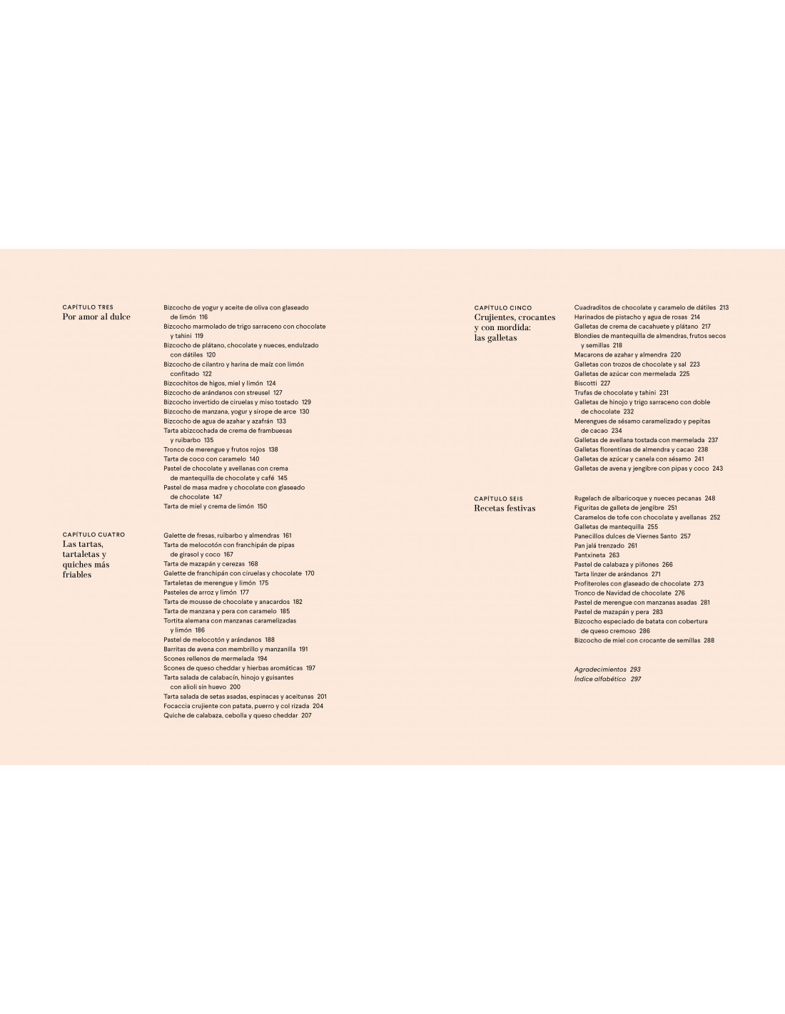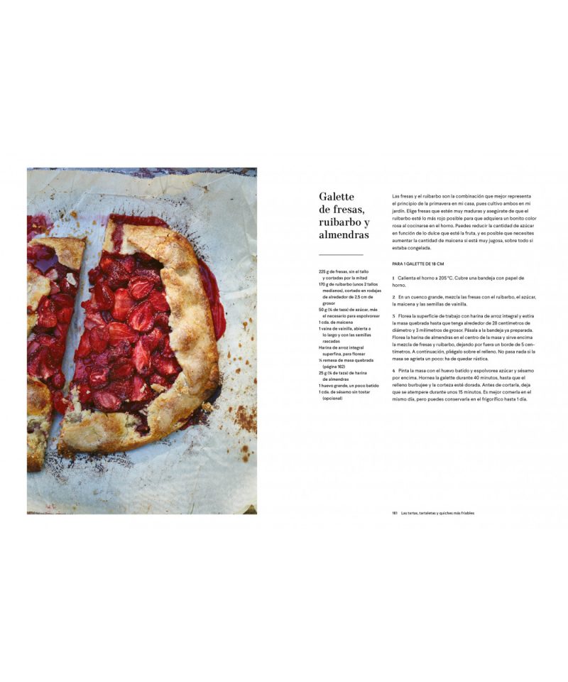 El libro abarca, como no podía ser de otra manera, numerosas recetas de bizcochos, galletas, tartas, tartaletas y quiches que despiertan las papilas gustativas del lector e incluyen rellenos dulces y salados. Pastel de chocolate y avellanas con crema de mantequilla de chocolate y café, bizcochitos de higos, miel y limón o scones de queso cheddar y hierbas aromáticas son algunos ejemplos de este amplio recetario.