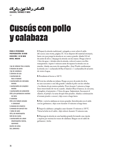 Alaoui recupera los grandes clásicos de la cocina marroquí y les aporta una frescura novedosa. La cocina marroquí transmite toda la riqueza de la historia de este país de los mil y un colores. Sabrosas, variadas y coloridas, sus recetas representan una oda al compartir y a la hospitalidad. Surgida de una tradición milenaria, la cocina marroquí ha sabido renovarse con los tiempos, liberarse de sus códigos para abrir sus fronteras al tiempo que se nutre de influencias mediterráneas, ya sea de Grecia o de los países de Oriente Próximo. La audacia de las nuevas generaciones de chefs le confiere un sabor más depurado, mayor frescura, sin más especias que la cantidad precisa. Una cocina rica en vegetales, con azúcares naturales y repleta de platos para compartir.