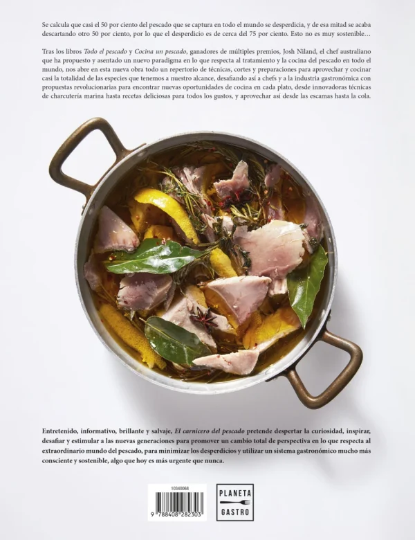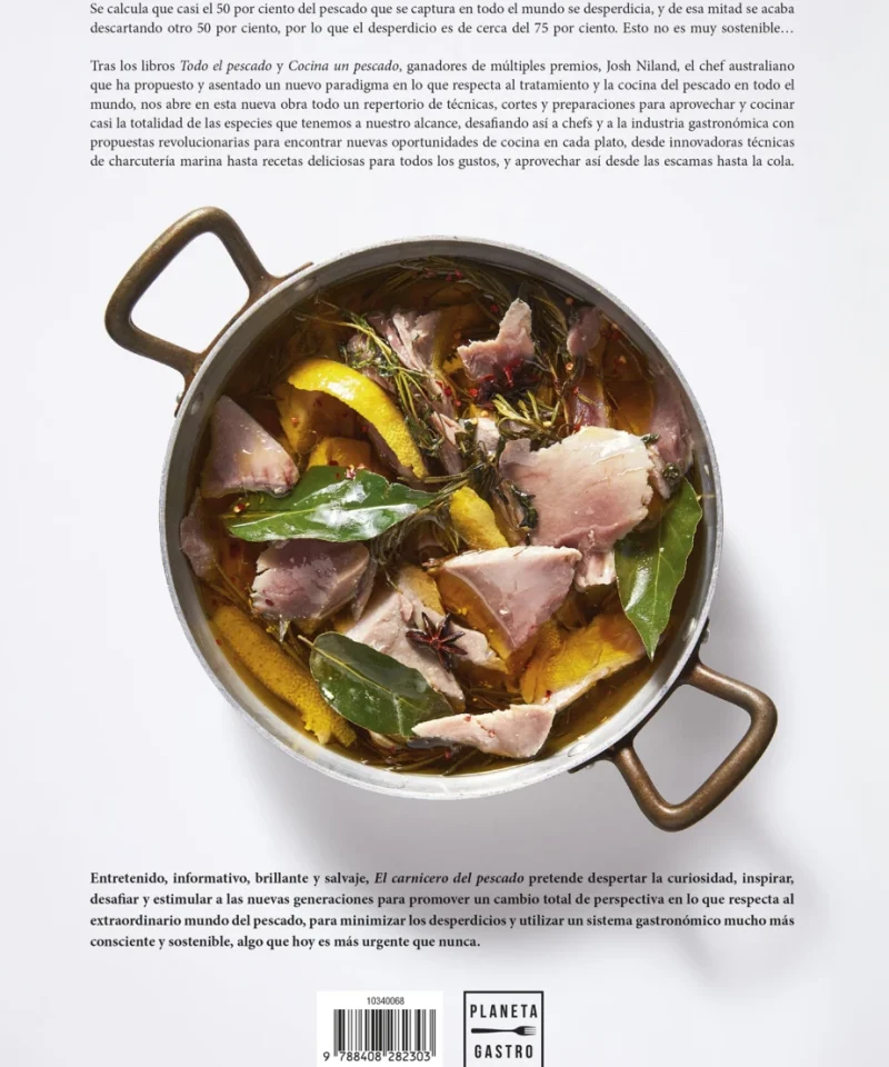 Tras los libros Todo el pescado y Cocina un pescado, ganadores de múltiples premios, Josh Niland, el chef australiano que ha propuesto y asentado un nuevo paradigma en lo que respecta al tratamiento y la cocina del pescado en todo el mundo, nos abre en esta nueva obra todo un repertorio de técnicas, cortes y preparaciones para aprovechar y cocinar casi la totalidad de las especies que tenemos a nuestro alcance, desafiando así a chefs y a la industria gastronómica con propuestas revolucionarias para encontrar nuevas oportunidades de cocina en cada plato, desde innovadoras técnicas de charcutería marina hasta recetas deliciosas para todos los gustos, y aprovechar así desde las escamas hasta la cola.