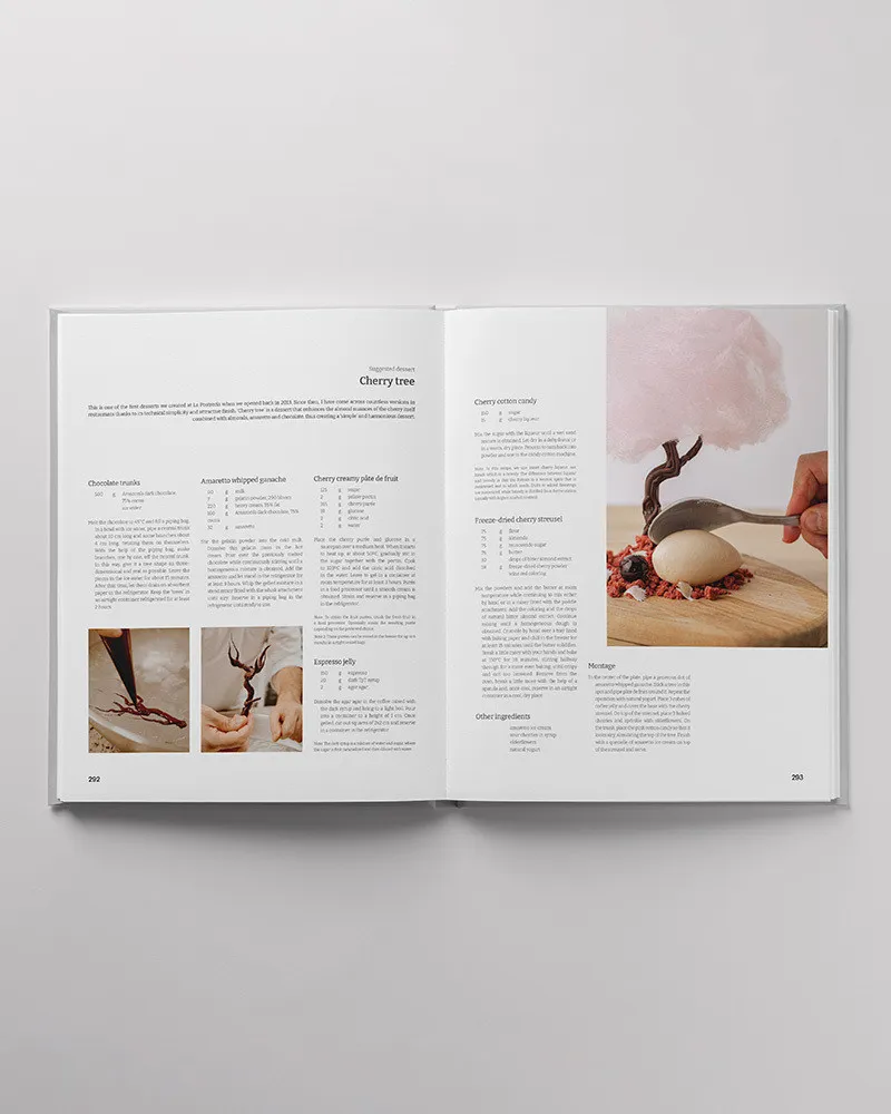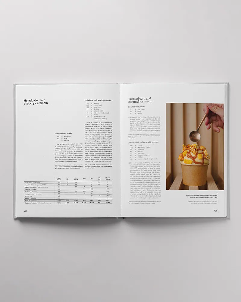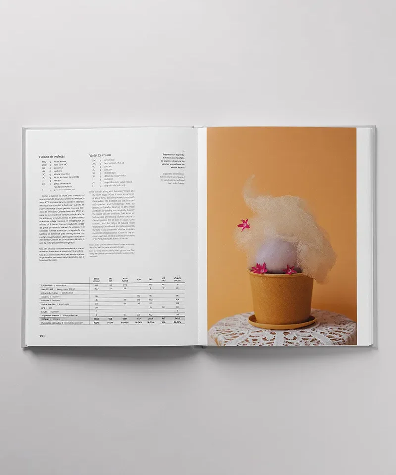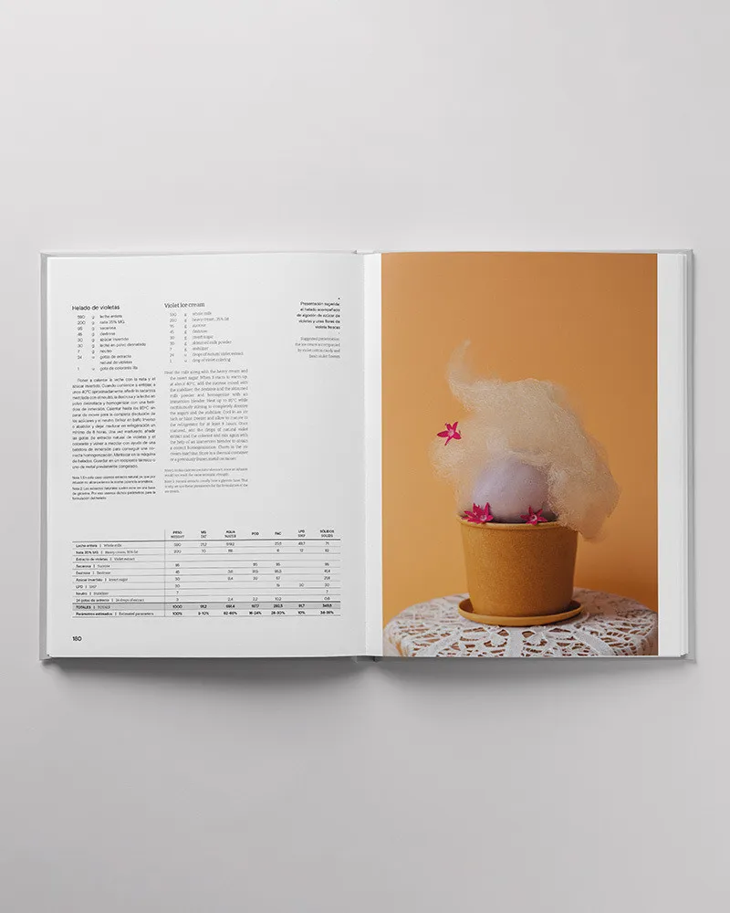 En la segunda parte, se ofrecen 45 recetas de helados con perfiles aromáticos muy distintos y más de 30 postres y sugerencias de elaboración. Cada propuesta está perfectamente contextualizada para que el profesional conozca a fondo el proceso creativo que sigue Jesús Escalera.