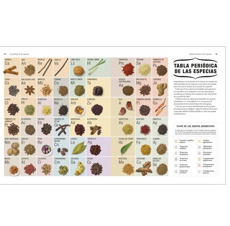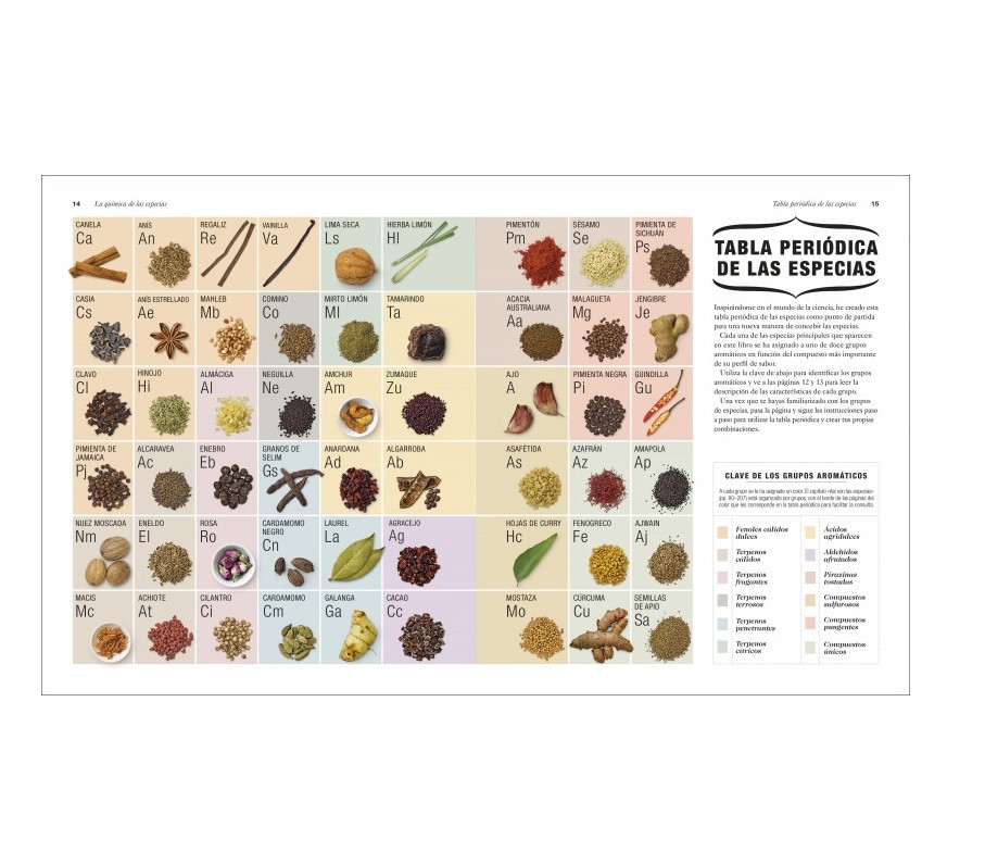 Una tabla periódica de especias que conectan los diferentes componentes del sabor y explica cómo las especias que tenemos en nuestra cocina pueden agruparse dentro de distintas familias de sabor. El capítulo sobre especias del mundo explora las principales regiones de las especias del mundo, incluyendo el Sudeste Asiático, Oriente Medio, América y la India, identificando las principales especias en cada una de las cocinas y aportando recetas para que crees tus propias mezclas.