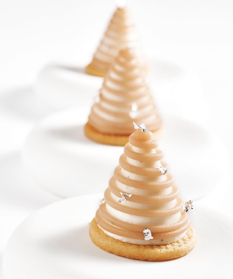 También dedica su atención a los grandes clásicos de la pastelería. Saint Honorés, xuixos, tiramisús, torrijas y montblancs son adaptados a la medida de un bocado, concentrando todo su encanto en tres centímetros de diámetro. El carácter lúdico que ha popularizado al chef a través de muchas de sus elaboraciones queda reflejado en los numerosos miméticos que es capaz de diseñar en sus surtidos mini. Cerezas, madeleines, aguacates y albaricoques cobran un realismo inusitado manteniendo ese carácter de joya o tesoro propio de lo que es pequeño.