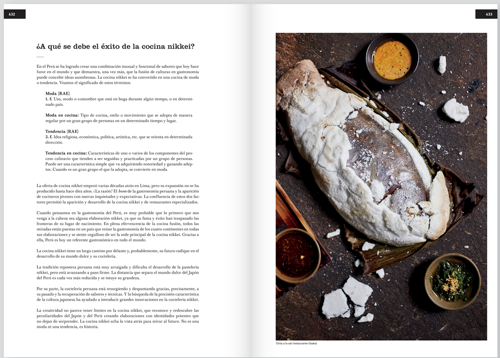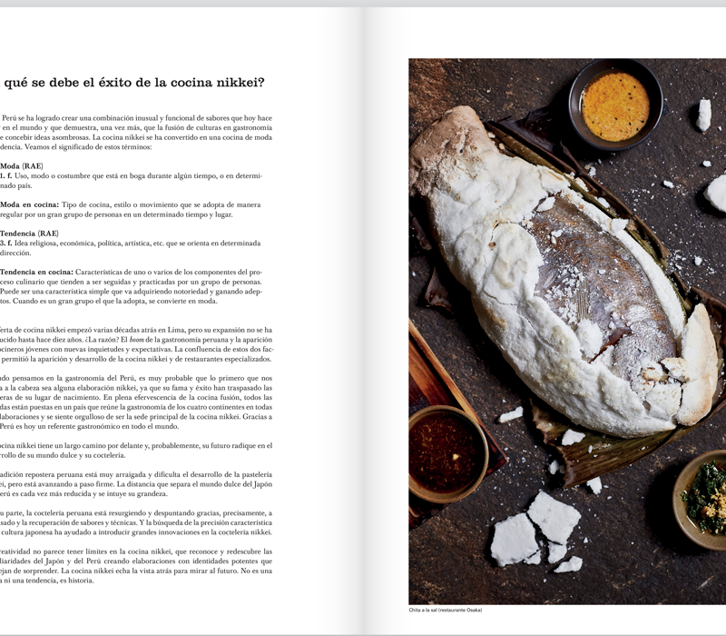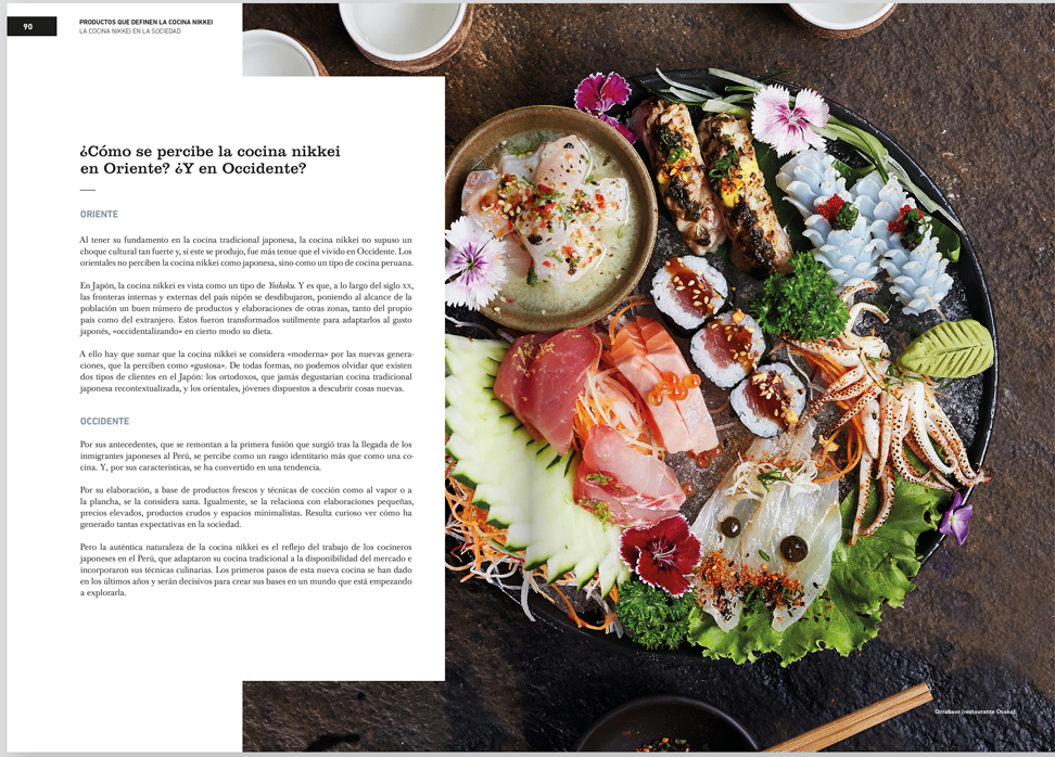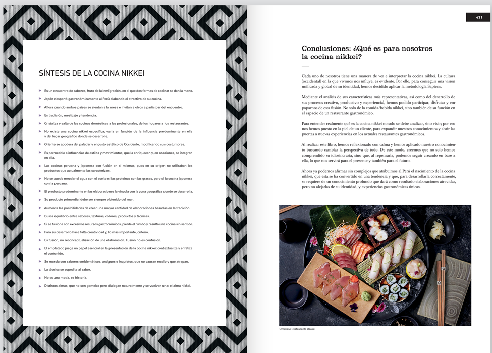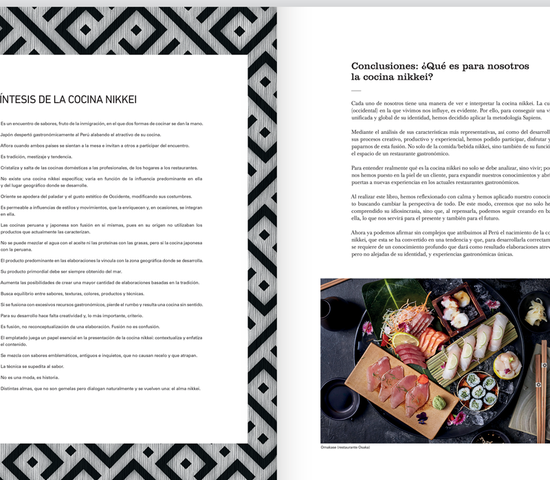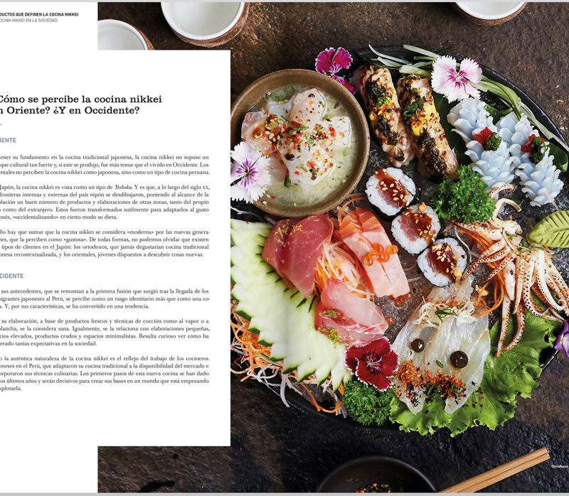 Además, aborda la historia, el léxico, los productos, las herramientas, las técnicas específicas para su desarrollo, y las elaboraciones que son el resultado final, lo que degustamos. Asimismo, en Nikkei el lector podrá introducirse en la experiencia gastronómica y conocer todos aquellos elementos que forman parte de ella, como son los olores, la temperatura del entorno, la decoración del espacio, la música, los sabores, la presentación de las elaboraciones y el contacto directo y humano con los camareros. Todos estos elementos, así como la experiencia gastronómica en sí, son intangibles y siempre produce una sensación o emoción.