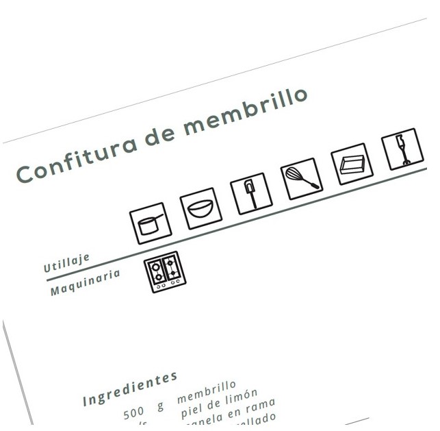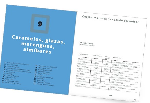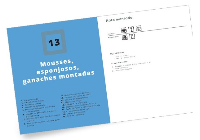 Desde un punto de vista práctico, cada una de las recetas aparece acompañada de una serie de iconos que indican qué utensilios y qué maquinaria y equipamientos se necesitan para realizar cada elaboración. Esta información visual y la organización de todo el contenido en diferentes familias convierten este recetario en una herramienta práctica y de enorme utilidad en obradores y cocinas.