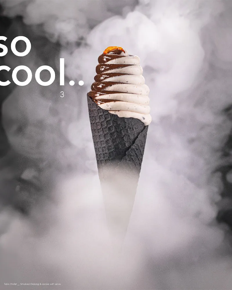 El helado activa así nuestros instintos más nostálgicos y lúdicos y Smoked Oolong & Cocoa Soft Serve de Profet representa a la perfección estas dos vías hacia la creatividad a partir de formatos y productos populares. Una excepcional revisión del helado soft llevado a un plano netamente gastronómico que presentamos en portada.